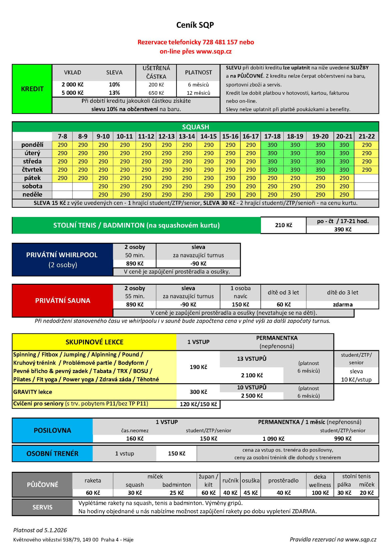- V případě, že kartu Multisport má pouze 1 hráč, druhý hráč doplácí 50% z ceny kurtu - na tuto částku nelze uplatnit další slevy, lze čerpat z nabitého kreditu z klientského účtu SQP.